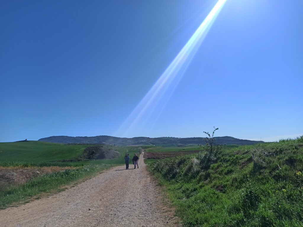 Irgendwann ging es dann nur noch zwischen Feldern gerade aus, der Weg endete am Horizont, nur um dann hinter dem nächsten Hügel genauso gerade weiter zu verlaufen. Die Sonne stieg indes bei wolkenlosem Himmel immer höher und höher. Man hätte sich daher heute also eher mit „Burn Camino“ statt „Buen Camino“ gegenseitig begrüßen sollen – wie eine Mitpilgerin treffend bemerkte.