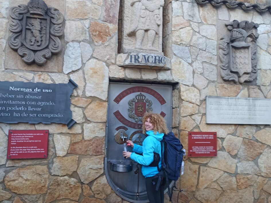 Heute morgen lohnte es sich ebenfalls zeitig aufzustehen, denn schon die ersten Wegkilometer führten an der Weinkellerei „Bodegas Irache“ vorbei. Hier wurde direkt am Camino eine Weinquelle für Pilger angelegt, bei der man seit uralten Zeiten (wenn man rechtzeitig da ist) den Wein direkt aus einem Hahn in der Wand zapfen kann.