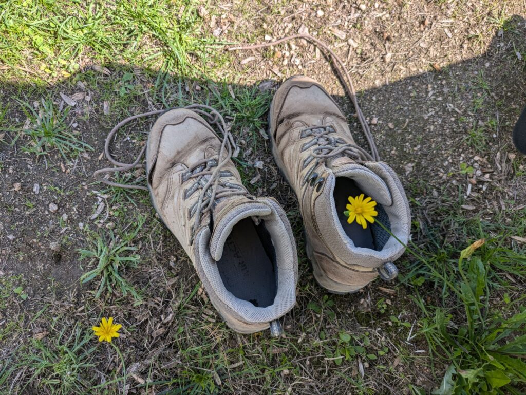 Ich ging indes geradezu bergab ohne Schmerzen und spürte in dem Moment einmal mehr, welch unglaublicher Segen es ist, weder „Rücken“, noch „Knie“, noch … zu haben. Mir geht es supergut, bis auf die zwei kleinen bekannten Blasen an den Zehen und meine zunehmend zerlaufenen (und vielleicht ein bisschen zertanzten) Wanderschuhe. Diese Erkenntnis stimmte mich in diesem Moment so unglaublich dankbar, was für ein Geschenk! Gute Besserung an alle verletzten und angeschlagenen Mitpilger!! 🫶🏻