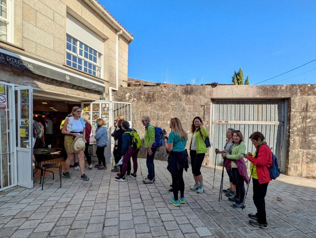 Aufgrund einiger längerer, reiner Waldkilometer an diesem Morgen und weil quasi der Montag hier in Bezug auf die Öffnung von Verpflegungsmöglichkeiten quasi der Sonntag 2.0 ist, war das allererste offene Café im allerersten Ort also der Place to be für alle frühstückshungrigen Pilger. Also alle. Gleichzeitig.