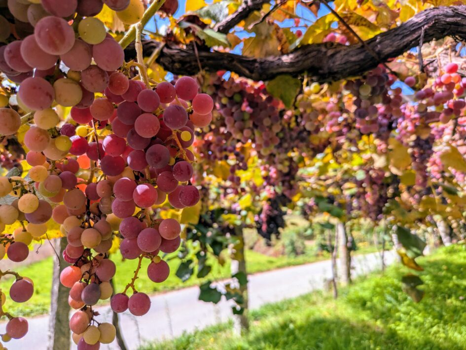 Der weitere Weg führte dann bei abnehmender Pilgerdichte, aber zunehmend herbstlicheren Temperaturen, entlang weiter Weinhänge und unter den Weinreben hindurch, deren Trauben wie in paradiesischer Vorstellung von oben herabhingen und tatsächlich so gut schmeckten wie sie aussahen.