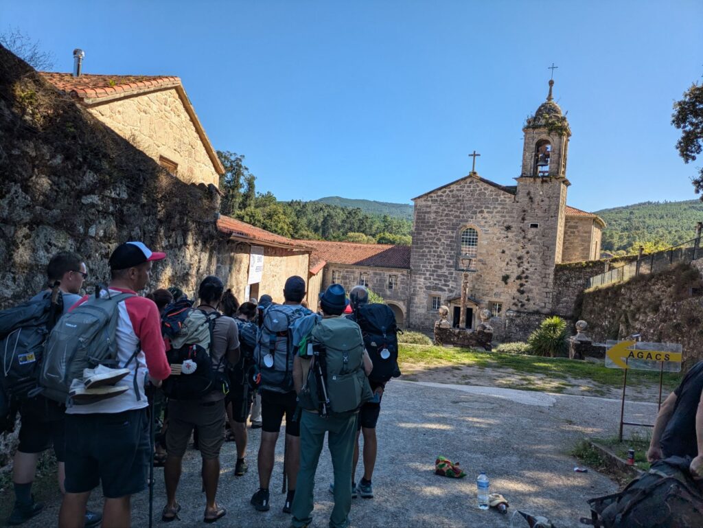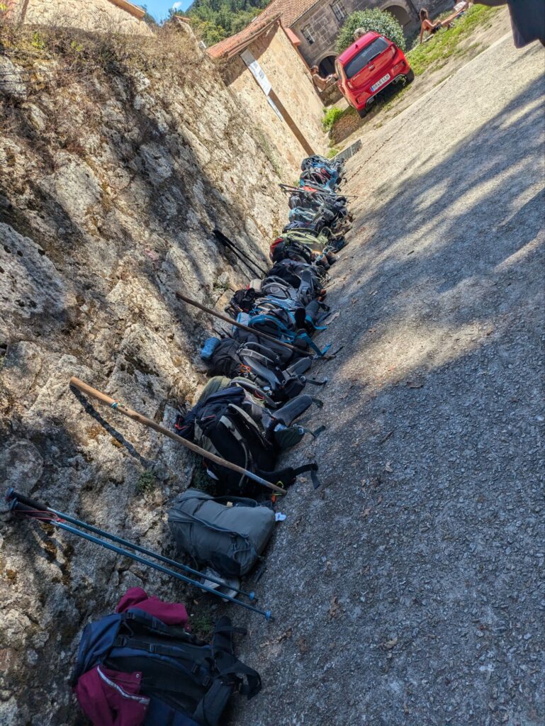 Die letzten Meter hinauf zum Kloster kam mir eine Frau entgegen und rief „You’re 26!“ (Du bist 26!) Ich war verwirrt, bog um die Ecke und sah dort schon eine Schaar an Pilgern in der Sonne warten. Wo kamen die denn alle her?! Wie ich erfuhr, sollte ich meinen Rucksack doch mit an die Wand in die Reihe der anderen wartenden Rucksäcke stellen – sodass er stellvertretend meine Nummer 26 von 30 maximal belegbaren Betten einnahm. Ich schmiss also das Gepäck in die Ecke und setzte mich mit an den Bordstein zu einer wartenden Jungsgruppe. Mir wurden Bier und Zigarre angeboten (was ich dankend ablehnte 😅), und dann saßen wir dort und warteten auf Einlass. (Kennt ihr die Reality-Sendung, wo Jugendliche im Kloster ihr Benehmen verbessern sollen? – Hab mich bisschen so gefühlt 😄) Generell schien sich hier heute vor allem die junge Pilgerschaft eingefunden zu haben (wahrscheinlich aufgrund des günstigen Preises, da alles auf Spendenbasis war).